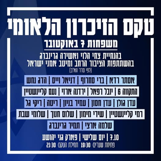 טקס הזיכרון של משפחות ה 7- באוקטובר יוקרן בשידור חי באולם רפפורט החל מהשעה 21:30 - הכניסה חופשית