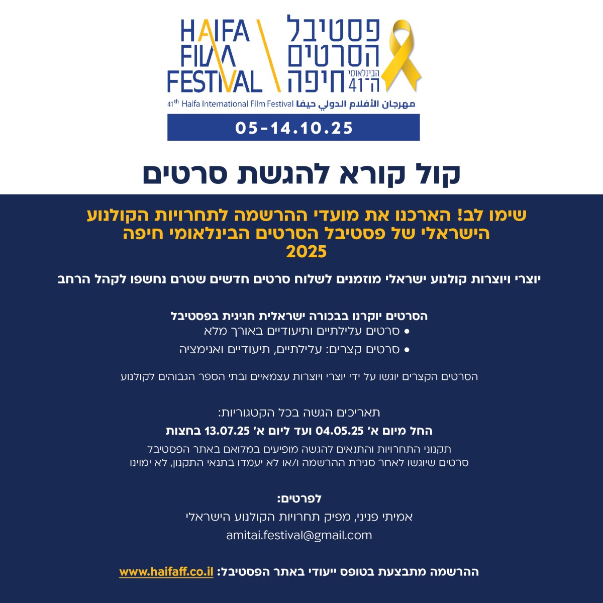לאור המלחמה והמצב הביטחוני שפקד אותנו בשבועיים האחרונים, ולאור ההבנה כי תהליכי עבודה של רבים מיוצרי ויוצרות הקולנוע הוקפאו בתקופה הזו, החליטה הנהלת הפסטיבל על הארכת מועד הגשת הסרטים למיון בכל תחרויות הקולנוע הישראלי