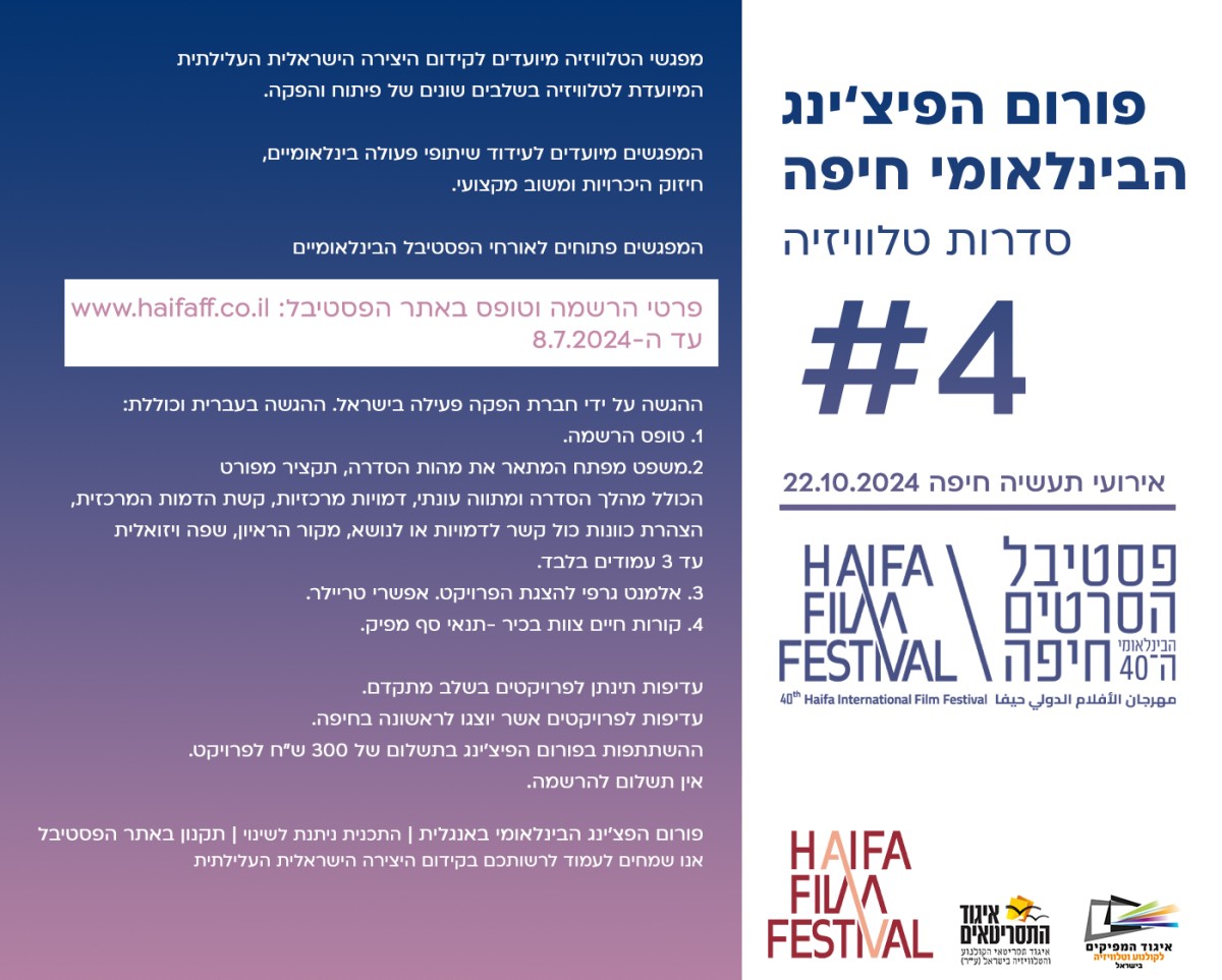 סדרה זוכה תשלב קרדיט ברולר הסדרה "זוכה פורום הפיצ'ינג הבינלאומי חיפה 2024" ואזכור שמו של מעניק המענק. WINNER OF HAIFA PITCHING FORUM 2024 כולל לוגו הפסטיבל ומעניק המענק.
